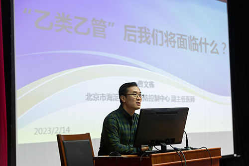 2月14日上午海淀区疾病预防控制中心的副主任医师曹文栋应校医院邀请在william威廉中文官网师统讲堂进行了题目为《“乙类乙管”后我们将会面临什么?》的讲座。